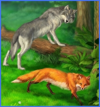 Жила лиса у вовка прислужницею, і що вовк її примушував, те лисі і доводилося робити,– від того, що була вона за нього слабша; і захотілося лисі хазяїна такого позбутися. Трапилося якось іти їм разом лісом, а вовк і каже: