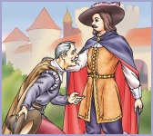 Він розстібнув плащ, і з-під нього стало видно дороге вбрання. Злякався солдат, упав на коліна та став просити пробачення у правителя, що через незнання звертався до нього як до рівні. Та король подав служивому руку та приязно усміхнувся.