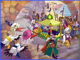 У перші дні вони помічали велике занепокоєння і смуток на вулицях. Але день так на четвертий після свого перетворення вони сіли на палац каліфа і побачили внизу на вулиці пишну ходу. Гриміли барабани й сурми, чоловік у золототканому яскраво-червоному халаті, оточений блискучими слугами, сидів на розцяцькованому коні. Всі кричали: «Хай живе Міцра, володар Багдада!» Тут лелеки на даху палацу перезирнулись, і каліф Хасид сказав: