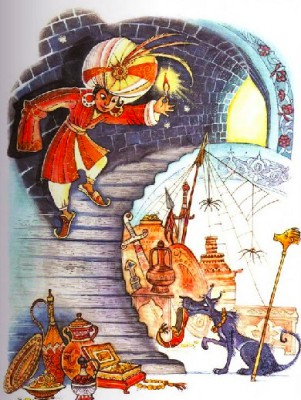 – Ти зовсім не вмієш поводитися з черевиками. Коли хочеш йти, то треба тричі покрутитися на одній нозі, а паличкою знаходитимеш скарби. В тому місці, де заховане золото, вона сама стукне тричі, а де срібло – двічі".