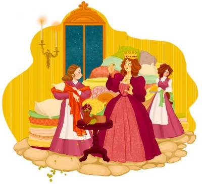 «Ну, про це ми вже самі дізнаємось!» – подумала стара королева, але нічого не сказала. Вона пішла до опочивальні, скинула з ліжка усю постіль, поклала на дошки горошину, потім узяла двадцять матраців і поклала їх на горошину, а тоді ще двадцять перин з гагачого пуху.