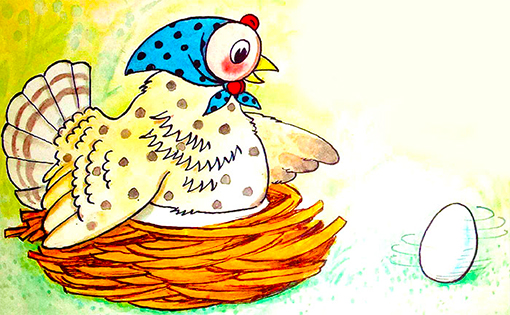Курка наздогнала втікача й повернула його на місце. Потім вона почала перераховувати майбутніх діток, увесь час плутаючись, тому що неслухняне яєчко стрибало, крутилося й перескакувало з місця на місце.