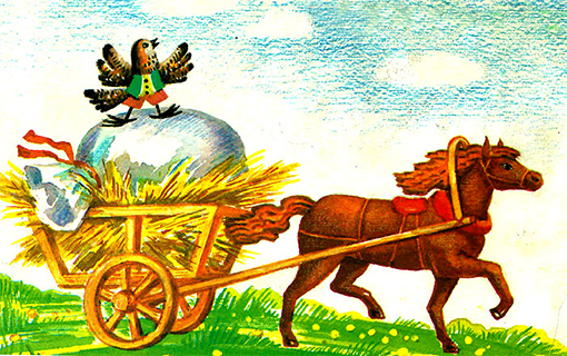 Їде віз полем. Біжить назустріч Мишка. Бачить – на возі мішок, у мішку – зерно, і Горобець спить.