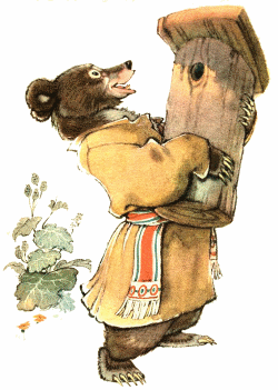 А ведмідь, наче господар, посува та оглядає, де кращий вулій, солодший мед, і як впав йому в око такий, зараз він лапу патлату туди, видира і лакомиться.