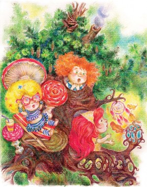 Чи знайомі ви хоч з одною бабою-ягою? Ні? А я знаю трьох дуже гарненьких та добрих сестричок бабок-їжок. Вони живуть, як всі порядні чаклунки, у лісі. Ці бабки-їжки дружелюбні, веселі та кумедні добрячки. Імена у них незвичні: Червоноволоска, Рудапатлатка і Жовтакудряшка. Коли ви побачите їх, одразу зрозумієте, хто з них хто. У Червоноволоски волосся довге, хвилясте і, немов квіти маку, червоного кольору. У Рудопатлатки густе та руде волосся, і стирчить у різні сторони, бо важко їх розчісувати. Скільки їх Рудопатлатка не причісувала, скільки не загладжувала, вони все одно стирчать у різні сторони. Але це не заважає їй бути привабливою та гарною. А Жовтакудряшка, відповідно, з жовтим кучерявим волоссям. Ця бабка-їжка своїм виглядом нагадує жовту та пухнасту кульбабку, тому навколо неї завжди літає багато метеликів та бджілок.