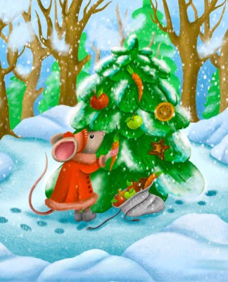 Йде вона по лісу, вітер її здуває, хуртовина стежку снігом засипає, мороз щічки щипає. Важко Мишці проти них іти одній-однісінькій.
