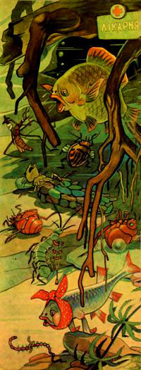 – Гм, лікар?.. А-а, це ти про П’явку Медичну! Тоді, голубонько, до берега греби. Там, під старим корчем, і знайдеш її.