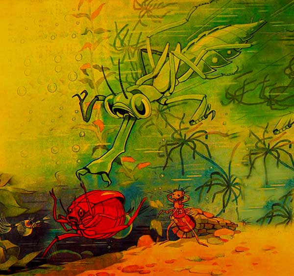 І вони швидко-швидко попливли. Невдовзі кровожерлива личинка зосталася далеко позаду. Переконавшись, що за ними ніхто не женеться, втікачі зупинилися перепочити.