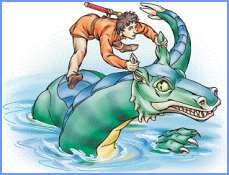 А страховисько тим часом помітило хлопця та підплило ближче, сподіваючись поснідати. Витягнуло довгу шию й ось-ось схопить невдаху. Парубок так нажахався, що не міг вимовити ні звука.