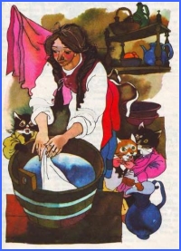 От послала вона якось пасербицю нарвати в полі Петрових батогів. Шукала їх дівчина, шукала і раптом натрапила на велику головку кучерявої капусти. Взяла її обома руками за качан, тягла, тягла – насилу вирвала. Дивиться, а там, де росла капустина, видно льох із східцями. От дівчина пішла й пішла тими східцями і раптом опинилася в якійсь хатині, а там було повно котенят. І диво: кожне котеня свою роботу робить: те білизну пере, а те воду носить, це шиє, а те посуд миє, а он оте тісто місить. Дівчина попросила в одного котенятка віничок і замела в хатині, другому білизну попрати допомогла, третьому відро з криниці витягла, четвертому хліб у піч посадила.