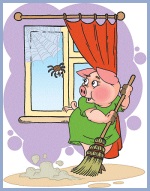 У давнину не було тваринки, працьовитішої та охайнішої за свиню. Хвостата понад усе любила чистоту. Прокинувшись із першими променями сонця, вмивалася, чепурненько вдягалася, зав’язувала синеньку хустинку та ставала до роботи. Якось на новорічні свята рожевощоку запросили в гості. Повернувшись додому, вона жахнулася: – Як же тут брудно! Не зволікаючи, господиня почала наводити лад у хаті. Коли роботу було завершено, раптом згадала, що не витерла пил на шафі. Свинка по драбині видерлась аж до самої стелі й хотіла змахнути бруд ганчіркою, та несподівано її зупинив тоненький голосок: – Стій! Хазяйка, нашорошивши вушка, озирнулася: – Нікого немає. Мабуть, почулося. Коли рожевощока знову схопила ганчірку, пролунало вже голосніше: – Обережніше! Придивившись, хвостата помітила в кутку невеличкого павучка. Малюк перелякано махав лапками, намагаючись захистити мереживне полотно. – Що ти тут робиш? – поцікавилася свинка. – Облаштував невеличку майстерню й виготовляю мереживні скатертини, – гордо зізнався прудконогий, демонструючи роботу. – Неймовірно! – замилувалася господиня. – Ніколи не бачила нічого красивішого. Напевно, необхідно бути дуже здібним, аби створити таке ніжне полотно. – Авжеж, – погодився ткач, – один необачний рух – і все зіпсовано. Тому хочу попросити: чи не могла б ти деякий час оминати цей куток. Маю відповідальне завдання – зшити вбрання для мишачого короля. – Звісно, не заважатиму, – запевнила хвостата. – Тільки дозволь зрідка дивитися, як працюєш. Може, теж навчуся. – Домовилися. Рожевощока неймовірно пишалася, що має такого талановитого сусіда, та час від часу спостерігала за його кропіткою роботою. Згодом майстер отримав нове замовлення й попросив господиню не прибирати біля вікна та під ліжком, аби віник випадково не порвав мереживо. Щоб не заважати павучку, свинка все більше часу проводила в ліжку й неймовірно розлінилася. Вона пізно прокидалася, снідала та знову вкладалася спати, боячись потурбувати сусіда. Ось так хвостата з охайної господині перетворилася на нечепуру та неробу. І нині можна побачити, як рожевощока інколи позирає вгору – милується роботою довгоногого ткача, а вдячний павучок учить її плести мереживо. Щоправда, поки що в ледащиці не виходить.