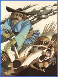 – Добре, так і буде. Тільки спершу піди до потоку, там вівці пасуться. Забий сто* баранів, наклади їх у бочки, набери ще сто бочок води, усе те поставиш на мене, та й будемо вирушати. Як летітимемо та битиме в мене з дзьоба полум’я, то вкинеш мені барана і заллєш водою. Та гляди, коли хоч раз прогавиш, упадеш додолу і розіллєшся смолою.
