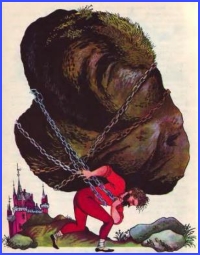 А коваль не зупинявся. Рясний піт стікав йому з чола, на скронях набрякли жили, дихати було важко. Та він поволі ніс камінь далі й далі від міста.