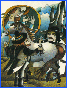 На третій раз обернувся він на гарного коня й наказав батькові, щоб той не віддавав його дешевше як за сто дукатів і щоб не забув, крий боже, здійняти з нього вуздечку.