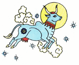 Потім корова підвела голову, подивилася на повний місяць – і злетіла над деревами! Вона підіймалася поволі, меншала й меншала, аж нарешті зникла.