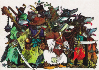 – Рятуйтесь, рятуйтесь! В нашу хату забралися чорти! Стромляю лапу у попіл – стріляють з рушниці, кидаюсь до діжки – ріжуть ножицями, хапаюсь за рушник – відьма коле голками, біжу до дверей – викидають мене кочергою. А в сінях настромили на залізні вила. Один гука: «Вище, вище, вище!» Другий волає: «Подавай його на горище!» А потім гепнувся я, аж зірки з очей посипались.