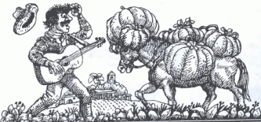 Занімівши з подиву, Бакальяо обережно підступив ближче, щоб краще розглянути цю дивину. І впізнав свою кобилу. Гарбузи на її спині виросли з насіння, яке попало в рану разом із попелом, бо селяни гарбузове насіння часто перемішують із попелом, у якому воно підсихає і добре зберігається до сівби...