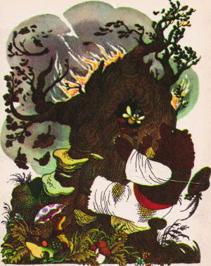 Але пожадлива бджола не хотіла залишати своїх скарбів. Вже над її головою загорілися гілки, в дупло пішов густий, їдкий дим, і Скнара-Ненажера вже почала задихатись.