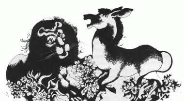 А саме тоді поблизу йшов лев і почув те ревіння. Дуже йому закортіло побачити, що воно там за співак такий незнаний. Вийшов лев із чагарів, побачив не кого як віслюка й страшенно здивувався. Досі йому ще ніколи не доводилося бачити такого звіра. Голос як грім, хвіст із китицею на кінці, а все ж таки не лев. От дивина!