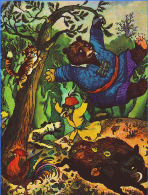 А ведмідь сидить на ялині й думає, що то пес і кіт змовляються вбити вовка, а півень притакує.