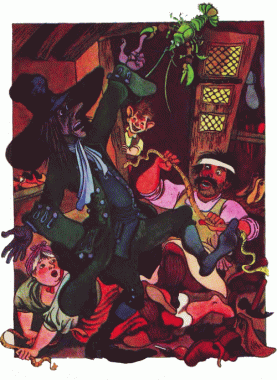 Ну ж і здивувався старий, коли зниклі чоботи раптом загойдалися над ним у повітрі! Обличчя в нього проясніло, він мерщій простяг руку, щоб їх схопити. Але тієї ж миті чоботи, мов заворожені, втекли вгору.