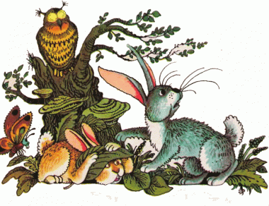 голосу. Тоді білочка кинула шкаралупку від горішка просто на маківку Нюскові. Шкаралупка вдарила зайчика, і він глянув угору.