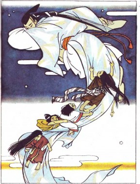 Раптом знявся вітер і шугнув у небо, а за ним – чоловік із дітьми. Поля й храмова покрівля опинилися внизу і щораз меншали й меншали.