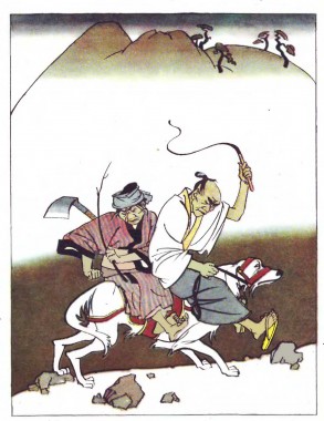 У горах він раптом спинився як укопаний. Старий і стара зіскочили, закричали: «Тут, напевно, заховано скарб!» – й заходилися орудувати сапою. Копали-копали й нарешті докопалися... З ями валом посунули вужі, ропухи, стоноги.