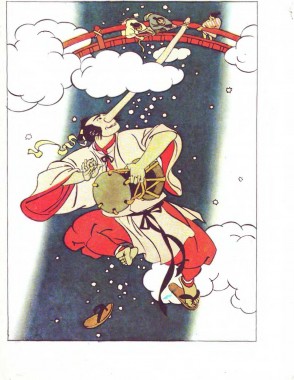 – Ой, що це таке? Хтось тримає мене за ніс! Треба поспішати! Генгоро несамовито бив у барабан і швидко піднявся понад хмари.