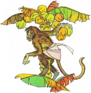 А щоб слова не розходилися з ділом, кинулася вона до стовбура пальми і швидко та спритно видряпалася на вершечок, туди, де ріс кетяг горіхів.