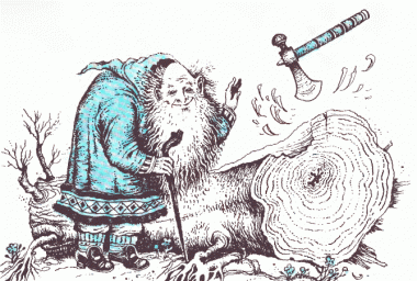– Іду до лісу зробити коритце для батька. Він не хоче їсти разом з нами,– відповів Пер.