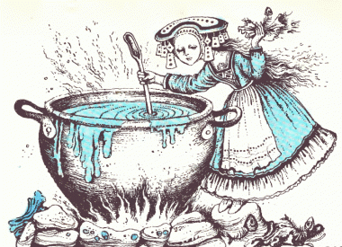 «Мабуть, десь вийшла»,– подумав велетень, узяв ложку й пішов до казана куштувати юшку. А в казані плавають старі підошви й ганчірки, і все так переварилося разом, що не знати, чи то юшка, чи каша.