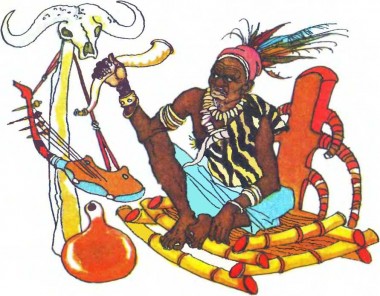 Тільки сказав він це, як з рогу раптом пролунав страшенний гуркіт, неначе то гримів грім. Клуб диму вирвався з землі поруч із застиглими від страху Мамбі й Коджу. Клуб диму ріс і ставав дедалі білішим. Від ядучого запаху паленого роїу друзі закашлялись. Невідомо звідки налетів легкий вітерець і швидко розвіяв дим. І тоді з’явився великий чаклун Фатала в урочистому вбранні з леопардових шкур. У лівій руці він тримав лев’ячого хвоста – символ найвищої влади над життям і смертю.