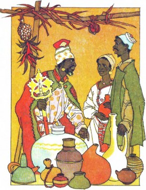 – О, великий царю! Не гнівайся! Я не мала наміру глузувати з тебе. Я просто хотіла натяками сказати тобі те, що думаю. Ось на столі горщики, накриті клаптиками. Всі ці клаптики різні. Одні пишні й дорогі, інші прості й дешеві, одні новенькі, інші старі. А пил у всіх горщиках однаковий. Мине час, і всі клаптики зотліють і стануть пилом. Так само й жінки – вродливі вони чи невродливі – постаріють. І та, що була красунею, з роками змарніє, і та, що була невродливою, стане в старості не гіршою від тієї, що замолоду була найгарнішою красунею. Тільки вірне серце – і замолоду, і в старості – залишається прекрасним. Ось що я хотіла тобі сказати. Отож не засмучуй мене та чоловіка. Не розбивай нашого кохання, не знищуй нашої сім’ї.